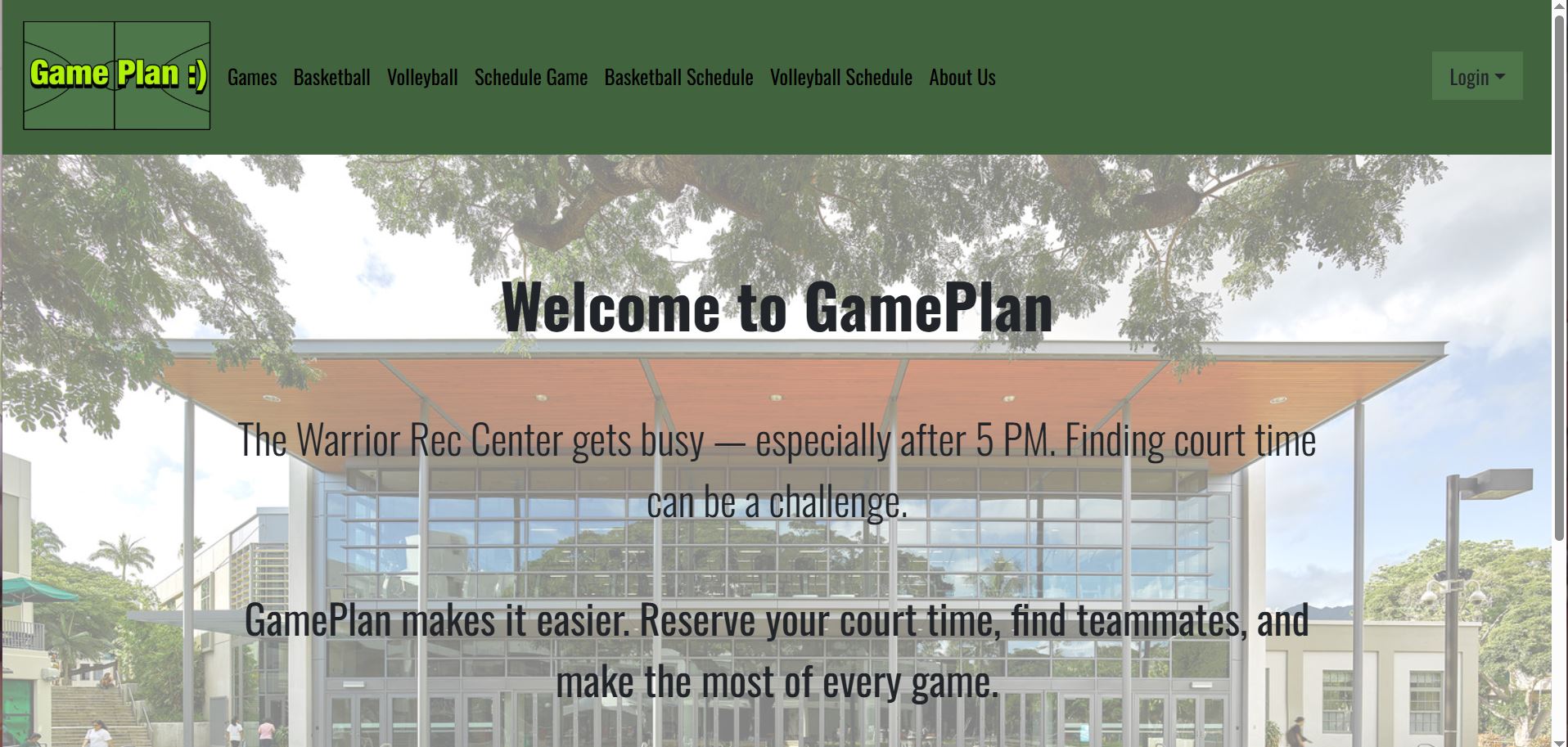 As a final project in ICS 314, students were tasked to create a web application as a group. As a group of 5 people, we created a web application called GamePlan, which allows people to reserve courts at the Warrior Recreation Center and find and join existing groups due to how packed the courts get after 5 pm. GamePlan includes nine features: